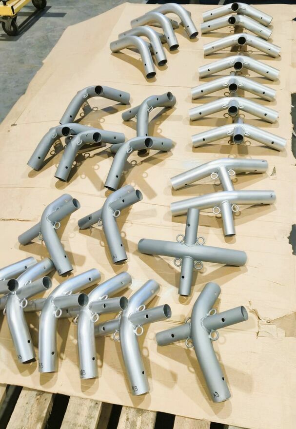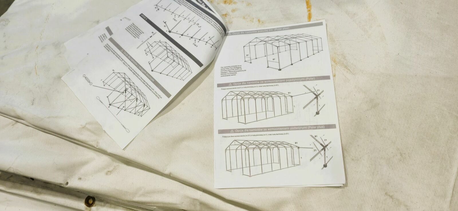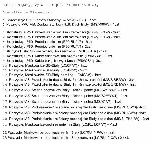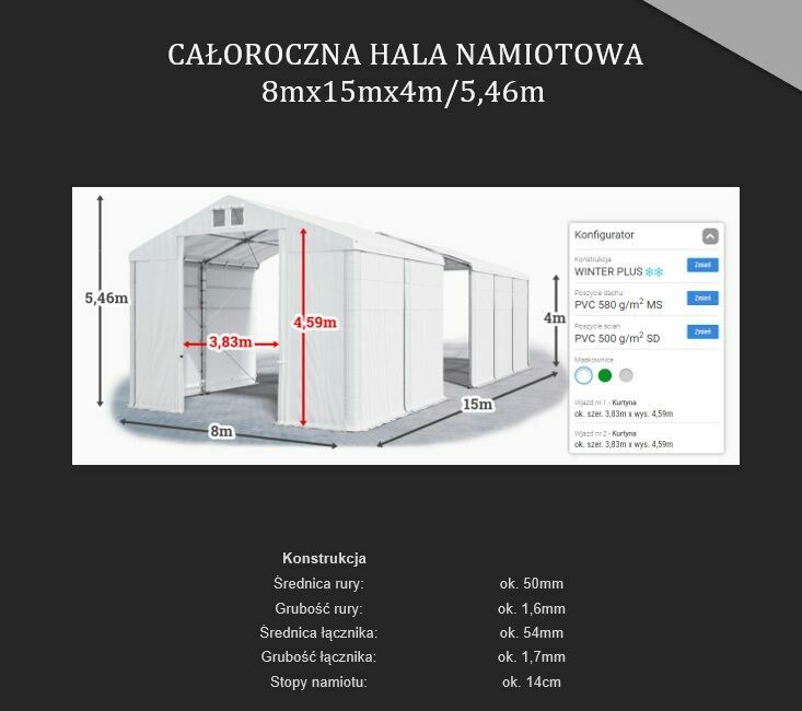 Na sprzedaż używany namiot przemysłowy całoroczny – idealny jako magazyn, hala warsztatowa, wiata dla maszyn, składowisko towarów lub garaż flotowy. Konstrukcja solidna, stabilna i odporna na warunki atmosferyczne (śnieg, wiatr, deszcz). Kupiony i zamontowany na kostce brukowej w Grudniu 2022 i zdemontowany w listopadzie 2023. Namiot jest kompletny (wszystkie elementy zostały sprawdzone). W jednostkowych przypadkach widoczny jest nalot korozji ale konstrukcja jest ocynkowana więc nie powinien to być problem. Namiot jest modułowy więc można go np. skrócić. Przez rok dzielnie służył jako magazyn profili, a z racji tego że posiada w ścianach szczytowych okna wentylacyjne, skraplanie na wewnętrznych ścianach nie następowało. Gorąco polecam.Namiot przemysłowy posiada dokładną instrukcję montażu. W galerii zamieszczona specyfikacja elementów, zdjęcia oraz wizualizacja namiotu przemysłowego z wymiarami.